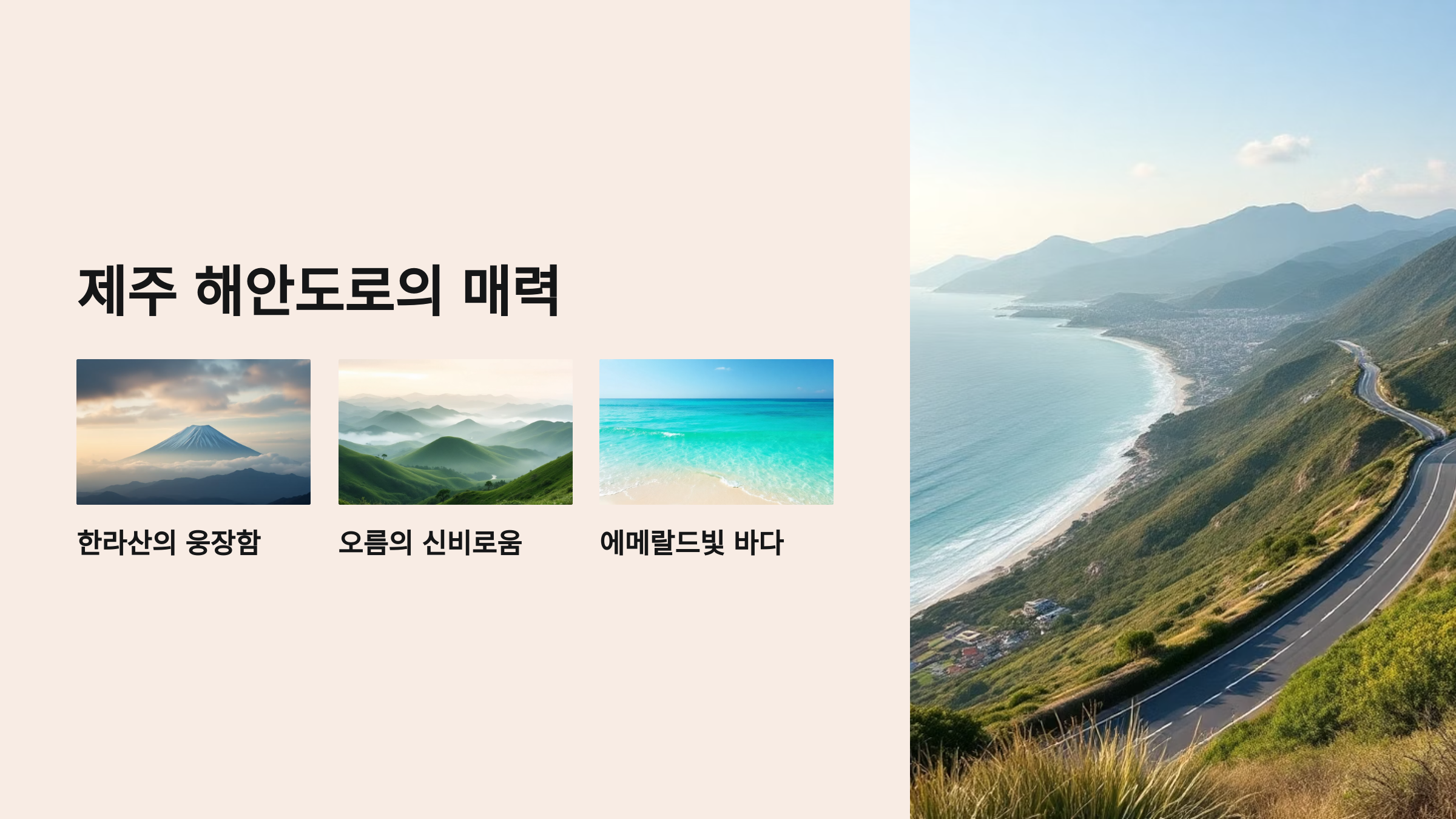 2. 협재 - 산방산 - 송악산 - 서귀포 코스 (남서쪽 해안): 협재에서 남쪽으로 내려오며 웅장한 산방산과 신비로운 용머리해안을 지나, 드라마 촬영지로도 유명한 송악산 해안을 따라 서귀포로 향하는 코스입니다. 중간중간 기암괴석과 주상절리 등 독특한 지질 경관을 감상할 수 있으며, 제주 남부의 따스한 햇살을 만끽하며 여유롭게 달릴 수 있습니다.