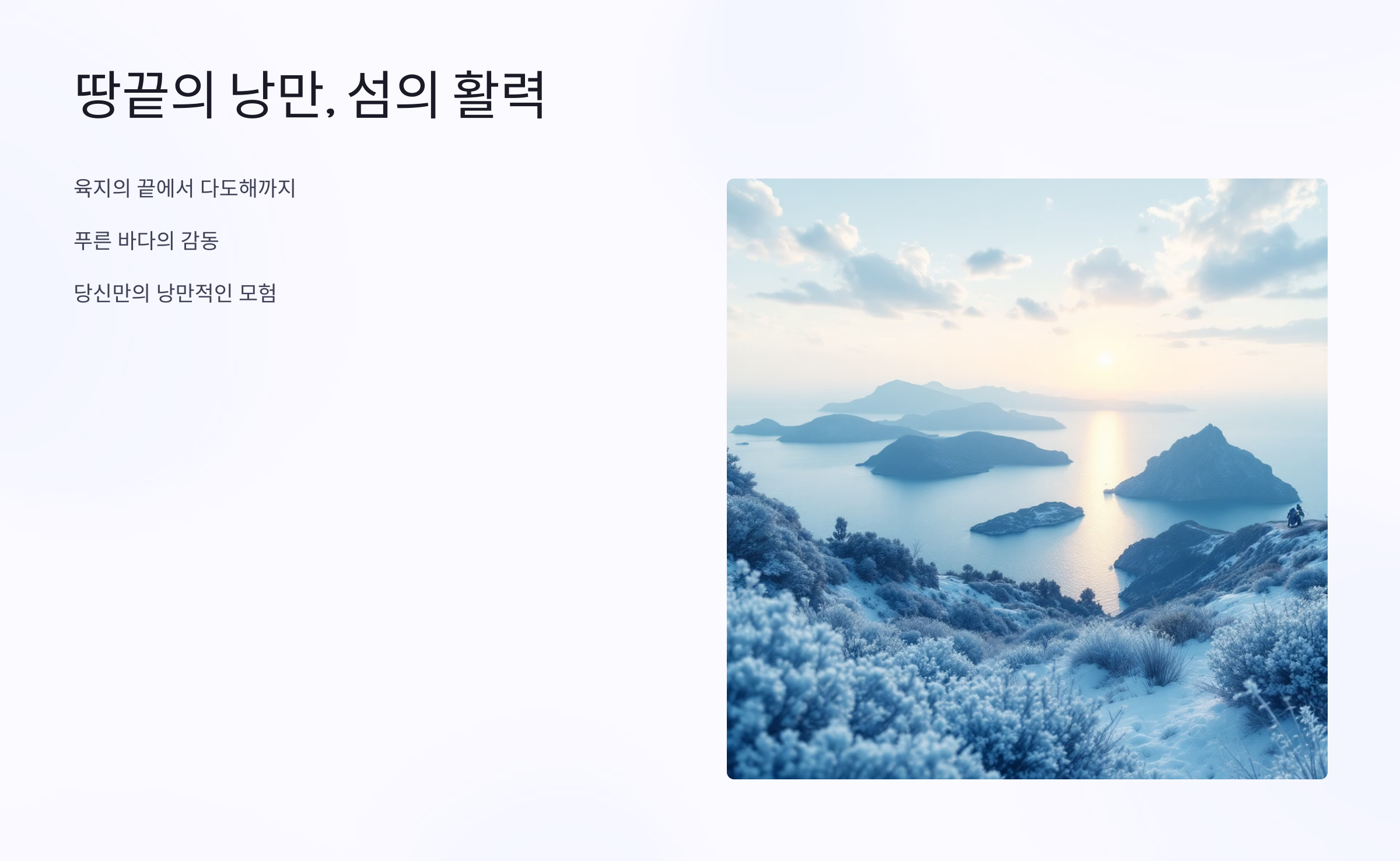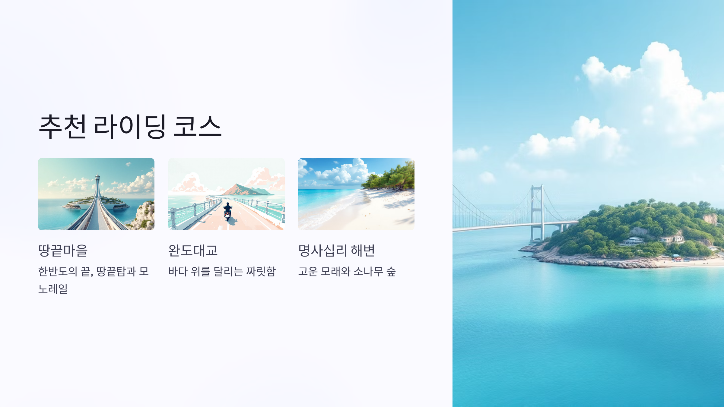 한반도의 시작이자 끝인 땅끝마을의 비장함, 그리고 청정한 다도해의 푸른 바다 위를 가로지르는 다리들이 어우러져 당신의 바이크 라이딩을 단순한 이동이 아닌, 마치 미지의 섬을 찾아 떠나는 특별한 모험처럼 만들어 줄 것입니다.