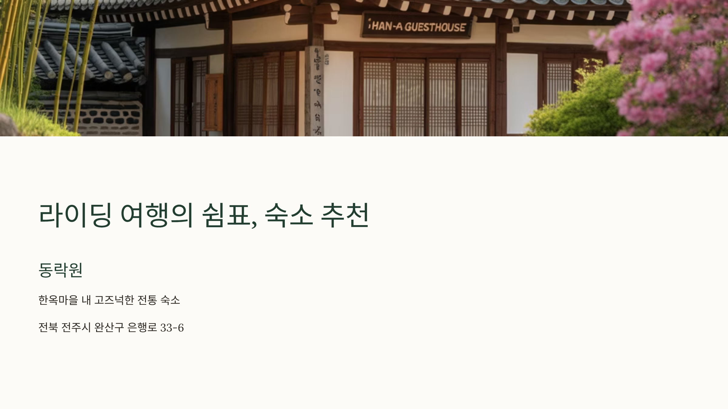 캠핑이 부담스럽거나 좀 더 편안한 휴식을 원한다면, 전주의 깨끗하고 시설 좋은 숙소에서 라이딩의 피로를 풀고 하루를 마무리하는 것도 좋은 선택입니다. 특히 한옥마을 내에서 전통의 멋을 느끼며 숙박하는 것을 추천합니다.
