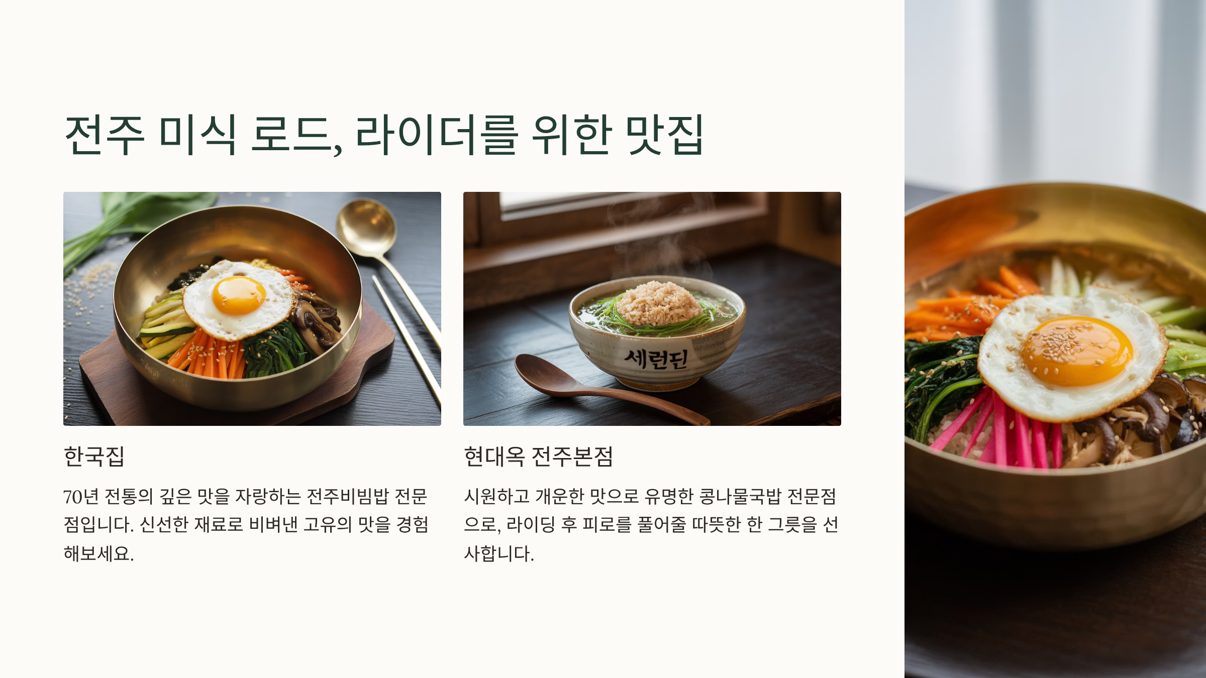 전주하면 빼놓을 수 없는 비빔밥과 콩나물국밥 등 전통 음식을 맛보며 라이딩의 즐거움을 더해보세요. 라이딩 후 든든하게 배를 채워줄 맛집들을 소개해 드릴게요.