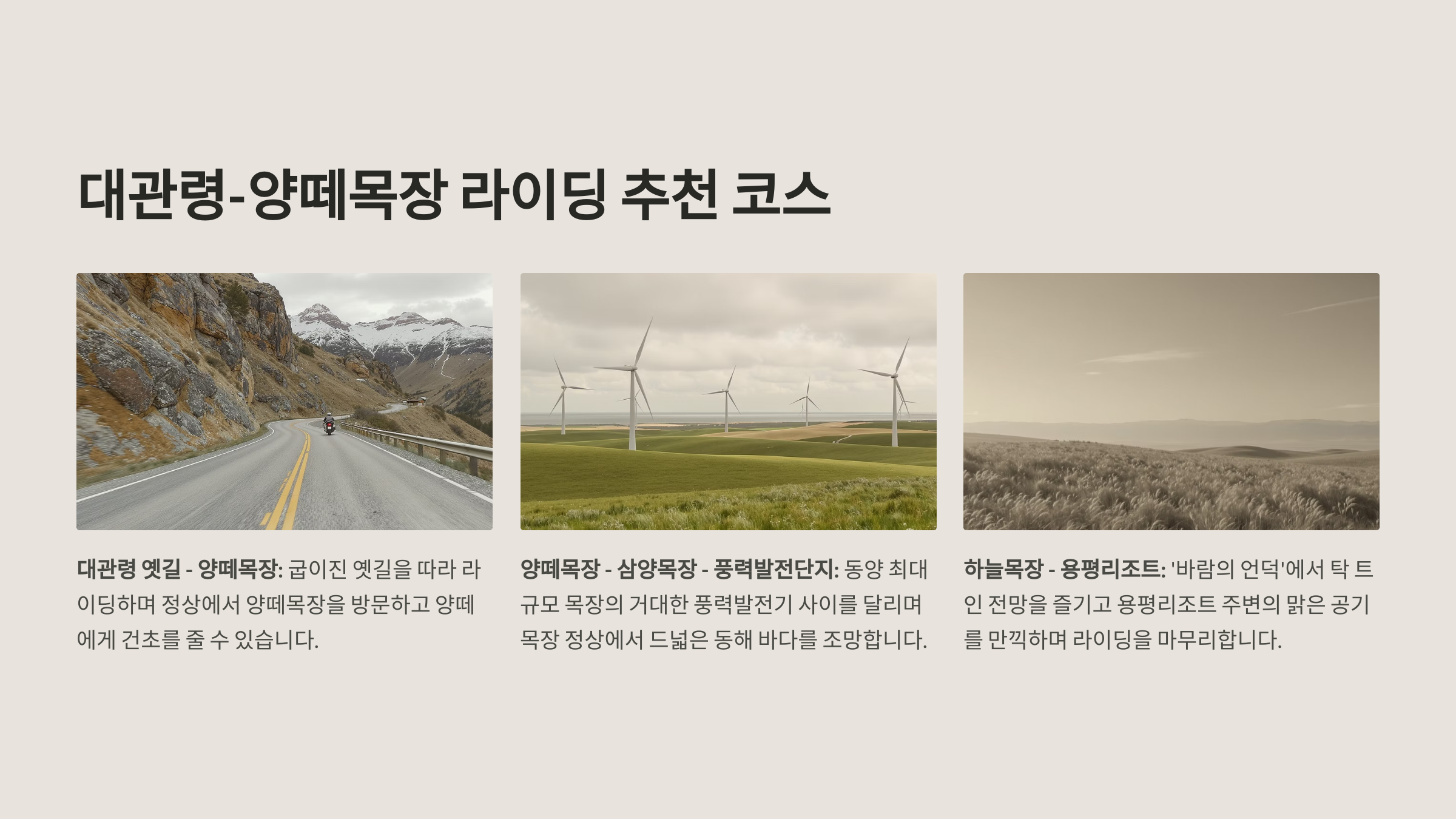 과연 어떤 매력이 라이더들을 이 강원도의 푸른 초원으로 이끄는 걸까요? 복잡한 도심을 벗어나 드넓은 자연 속에서 온전한 힐링을 찾고 싶다면, 지금부터 대관령-양떼목장 코스의 비밀을 함께 파헤쳐 볼까요?