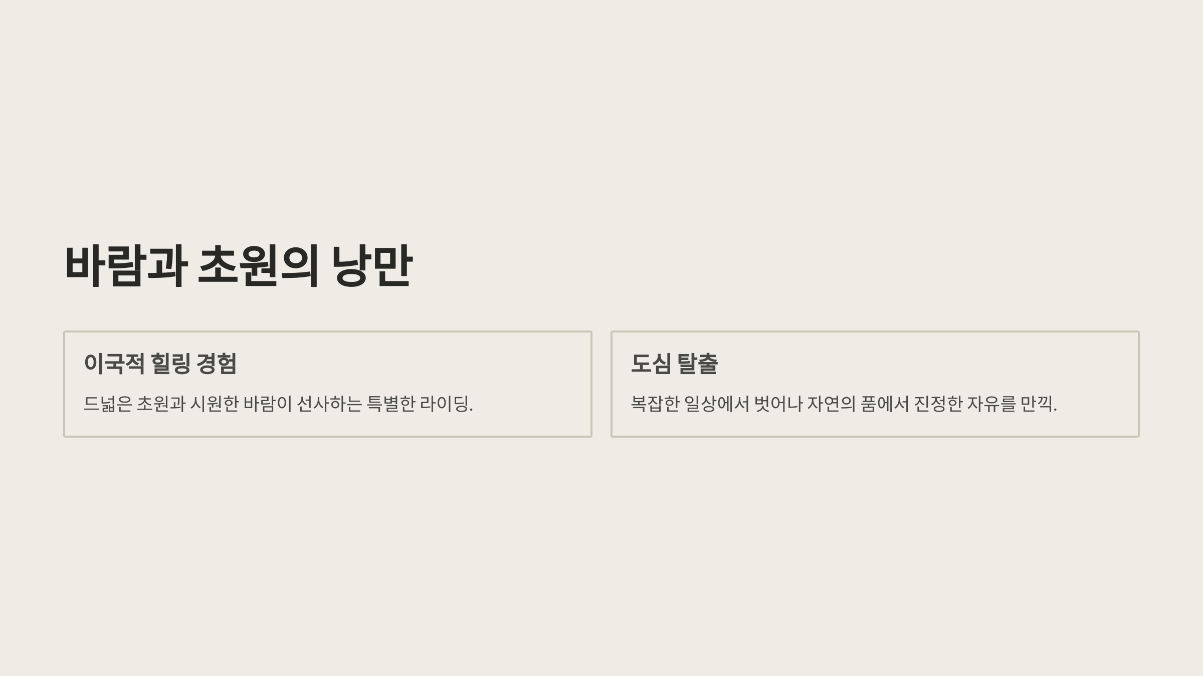 해발 800m 고원 지대에서 펼쳐지는 드넓은 초원, 목가적인 풍경 속에서 한가로이 풀을 뜯는 양떼들, 그리고 가슴을 탁 트이게 하는 시원한 바람이 어우러져 당신의 바이크 라이딩을 단순한 이동이 아닌, 마치 알프스 산맥을 달리는 듯한 이국적인 경험으로 만들어 줄 것입니다.