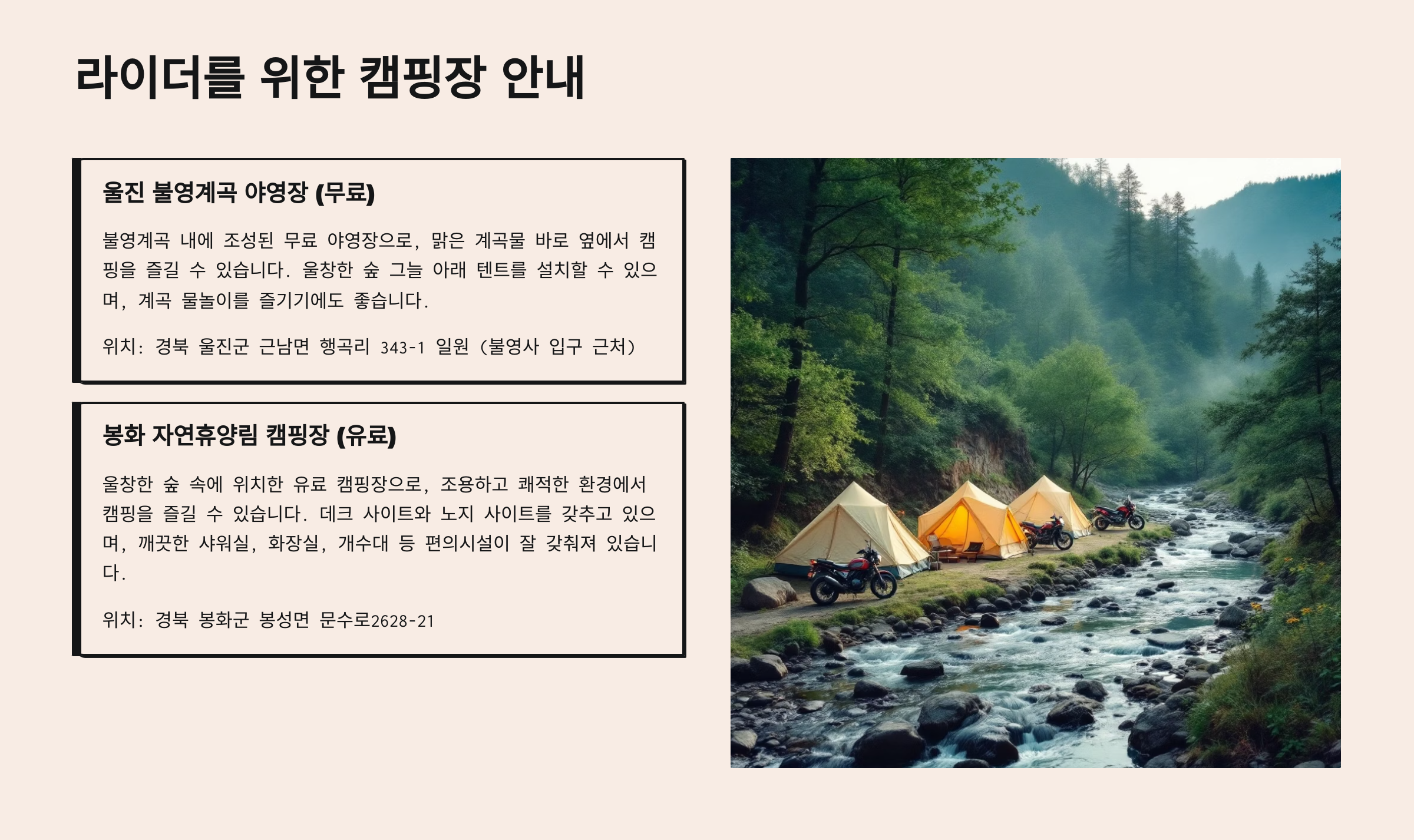 - 특징: 불영계곡 내에 조성된 무료 야영장으로, 맑은 계곡물 바로 옆에서 캠핑을 즐길 수 있습니다. 울창한 숲 그늘 아래 텐트를 설치할 수 있으며, 계곡 물놀이를 즐기기에도 좋습니다. 기본적인 화장실과 개수대 시설이 잘 관리되어 있어 무료임에도 쾌적하게 이용할 수 있습니다. 바이크 여행 중 자연 속에서 편안하게 하룻밤을 보내고 싶은 라이더들에게 추천합니다.