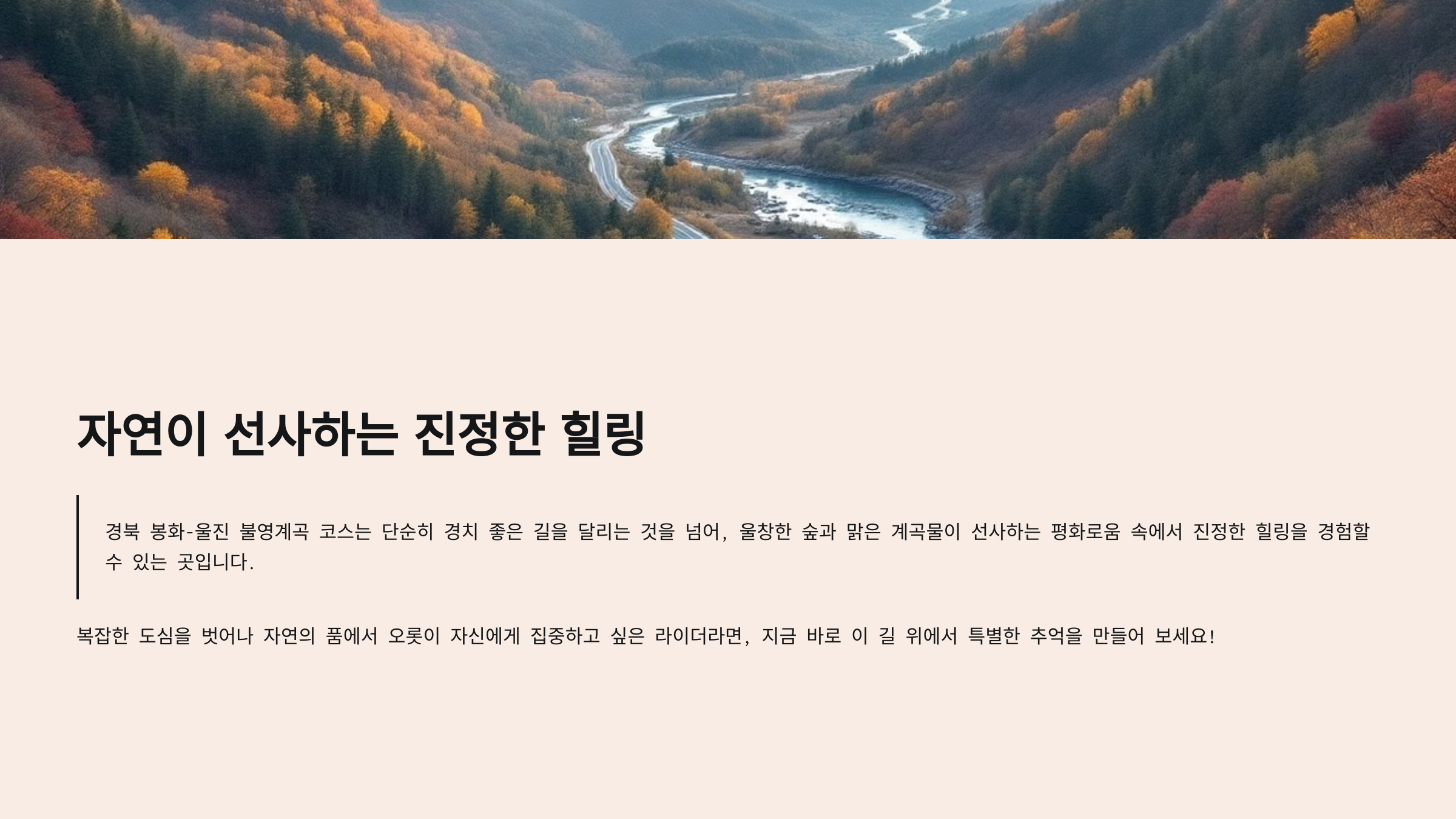 경북 봉화-울진 불영계곡 코스는 단순히 경치 좋은 길을 달리는 것을 넘어, 울창한 숲과 맑은 계곡물이 선사하는 평화로움 속에서 진정한 힐링을 경험할 수 있는 곳입니다. 복잡한 도심을 벗어나 자연의 품에서 오롯이 자신에게 집중하고 싶은 라이더라면, 지금 바로 이 길 위에서 특별한 추억을 만들어 보세요!