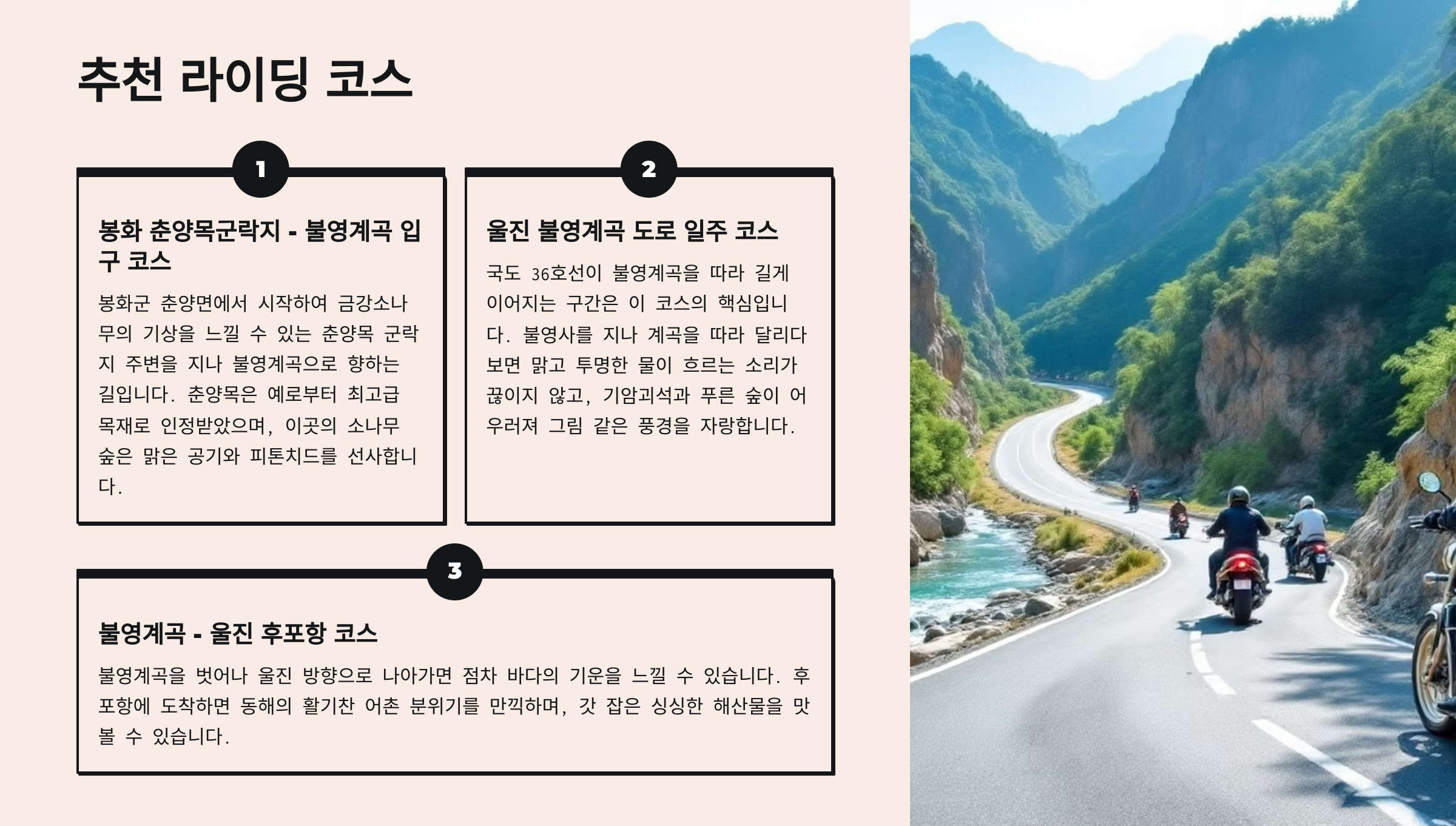 울창한 숲 속을 가로지르는 길, 수정처럼 맑은 계곡물이 흐르는 소리, 그리고 도시에서는 경험할 수 없는 한적함과 여유로움이 당신의 바이크 라이딩을 단순한 이동이 아닌 진정한 자연 속 힐링으로 만들어 줄 것입니다. 과연 어떤 매력이 라이더들을 이 봉화-울진 불영계곡의 숨겨진 비경으로 이끄는 걸까요? 복잡한 생각은 잠시 잊고, 자연의 품속에서 오롯이 자신에게 집중하고 싶다면, 지금부터 봉화-울진 불영계곡 코스의 비밀을 함께 파헤쳐 볼까요?
