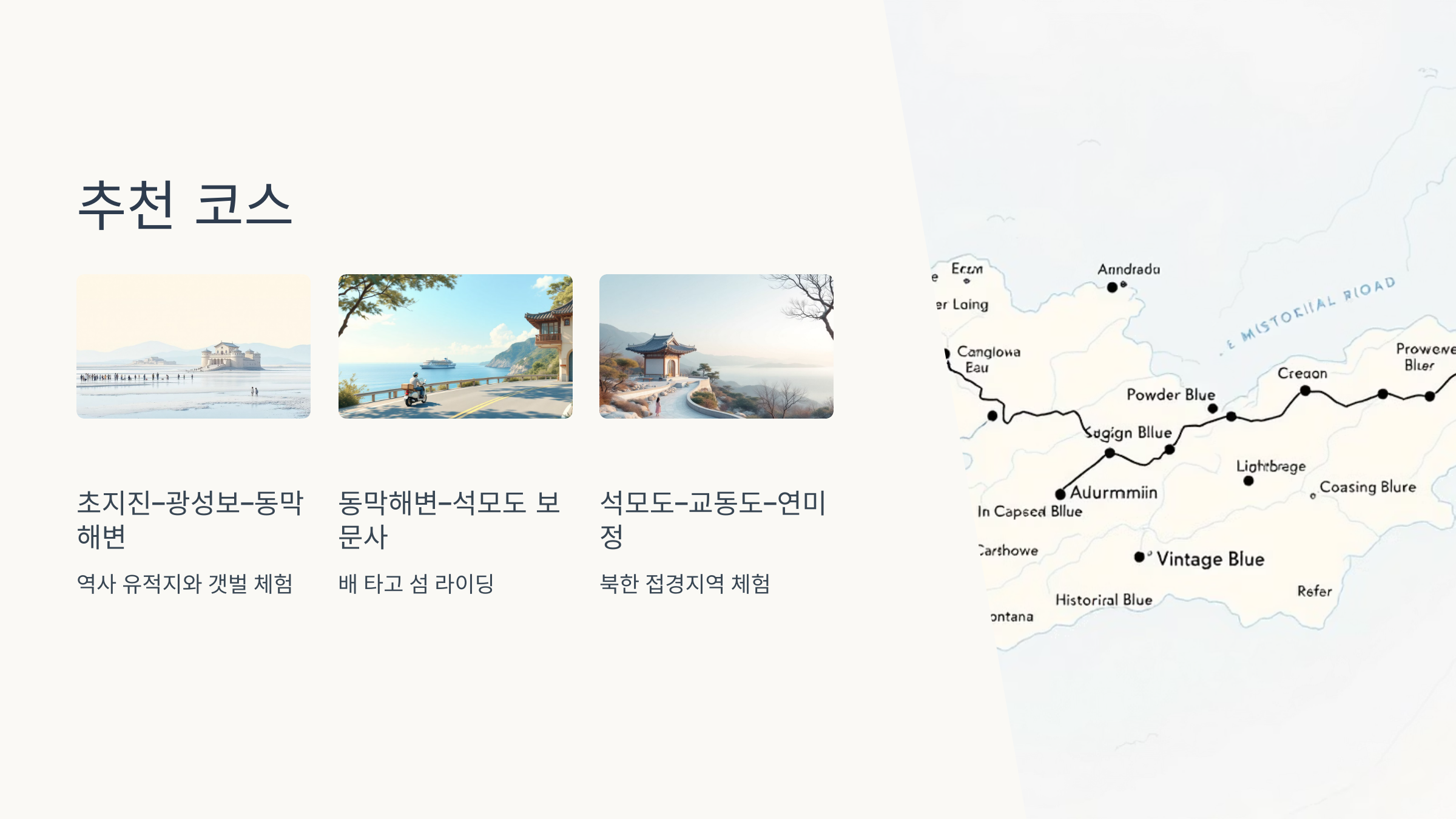3. 석모도 - 교동도 - 연미정 코스 (북서부 해안 및 섬): 석모도를 나와 다시 강화도로 돌아온 후 북쪽으로 향해 교동도까지 이어지는 코스입니다. 교동도는 북한과 가장 가까운 접경지역 중 하나로, 독특한 분위기를 느낄 수 있습니다. 대룡시장에서 옛 시장의 정취를 느끼고, 망향대에서 북녘 땅을 바라보는 것도 의미 있는 경험입니다. 강화도 북단의 연미정은 한강과 임진강이 합류하는 지점을 조망할 수 있는 곳으로, 역사적인 의미가 깊습니다.
