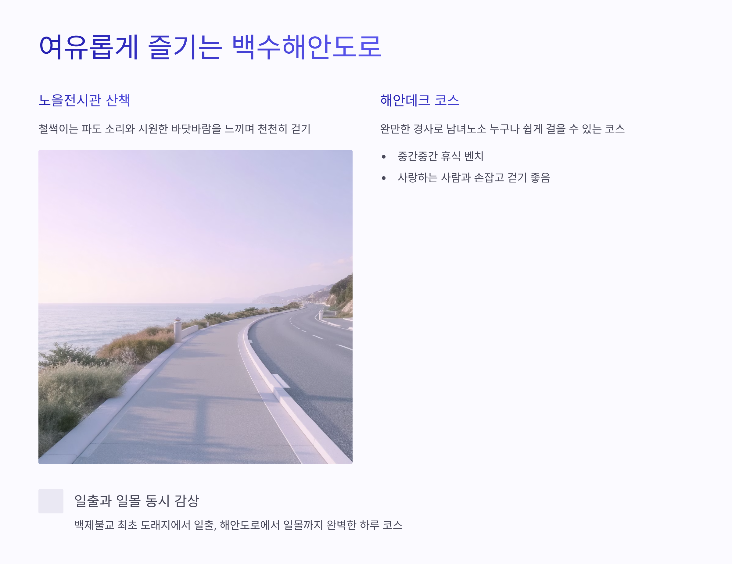 무엇보다 백수해안도로는 일출과 일몰을 동시에 볼 수 있다는 장점이 있어요. 물론 일출은 해안도로 바로 아래로 뜨지는 않지만, 인근 백제불교 최초 도래지에서 멋진 일출을 감상하고, 해안도로에서 환상적인 일몰을 마무리하는 완벽한 하루 코스를 계획할 수 있다는 거죠. 이건 정말 특별한 경험이 될 거예요.