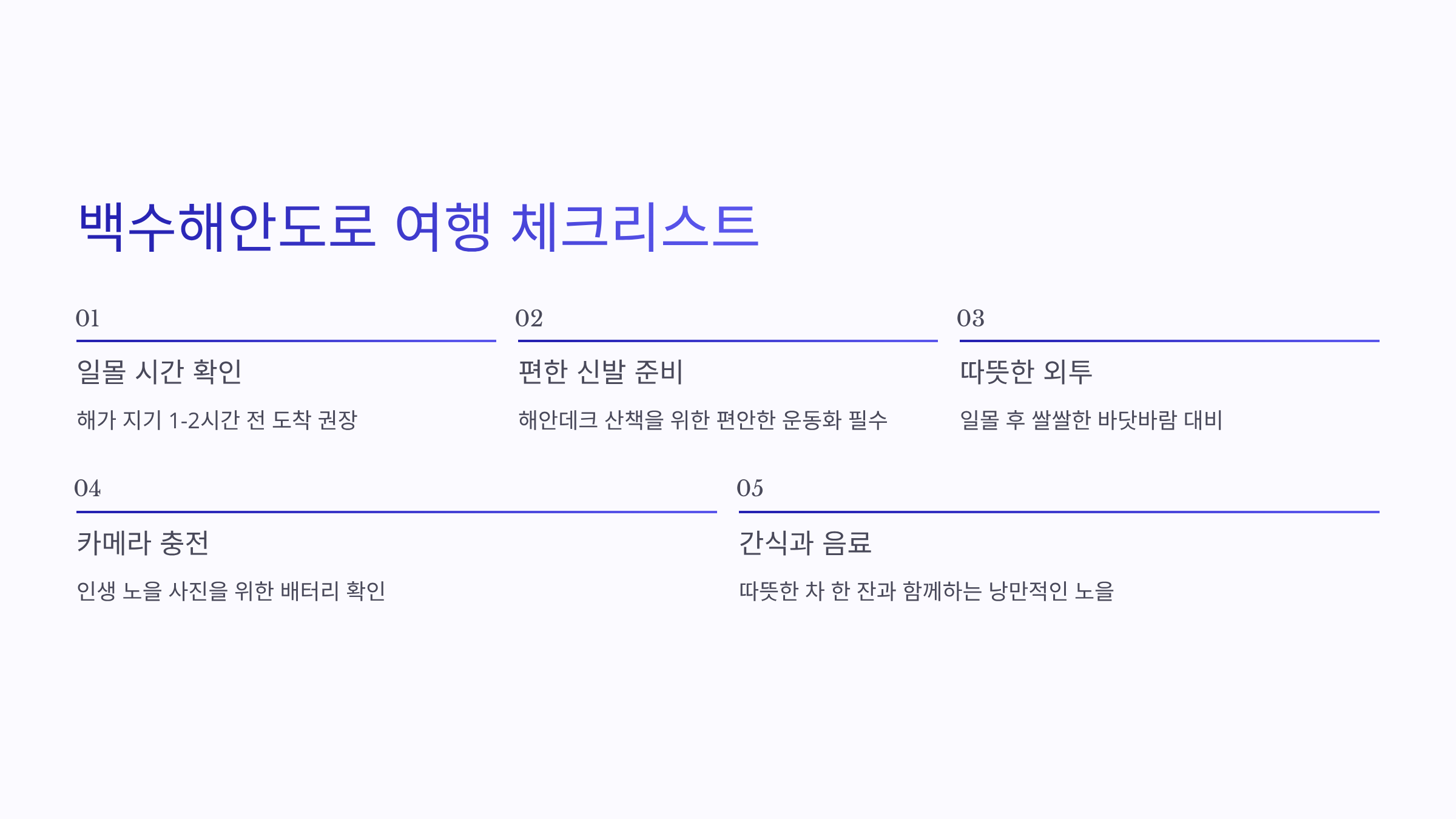 성공적인 백수해안도로 노을 여행을 위한 필수 체크리스트를 만들어 봤어요. 이 정도만 준비해도 완벽한 여행이 될 거예요!