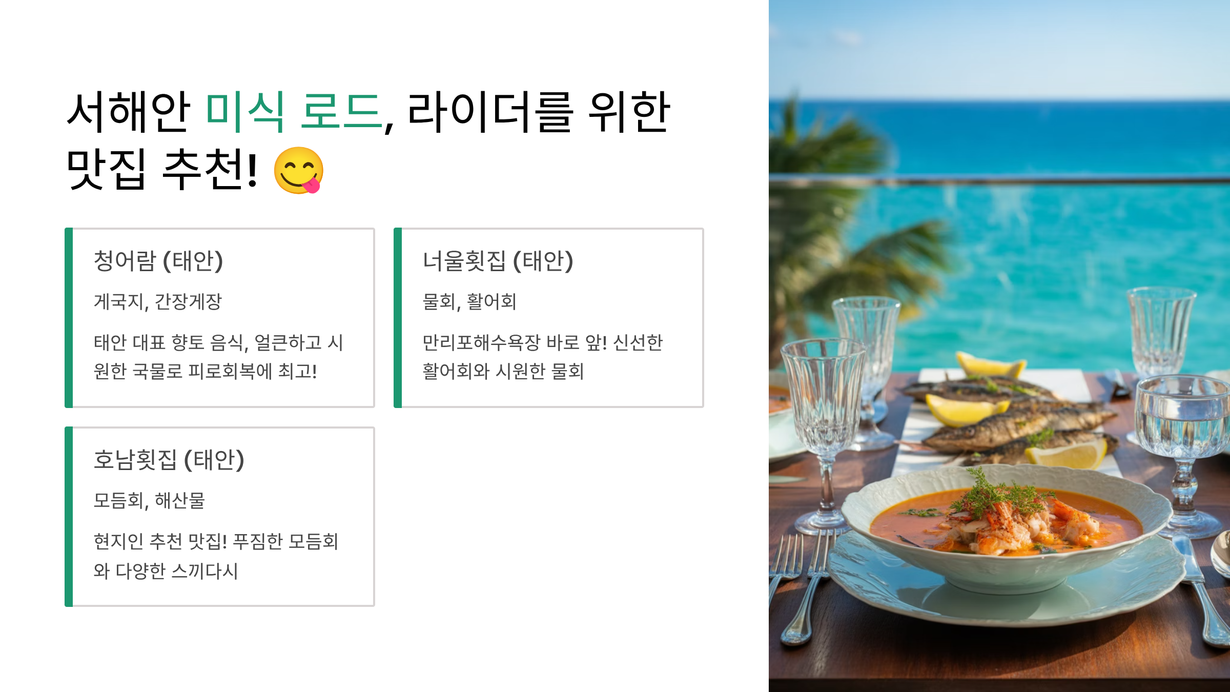 서해안 미식 로드, 라이더를 위한 맛집 추천! 😋