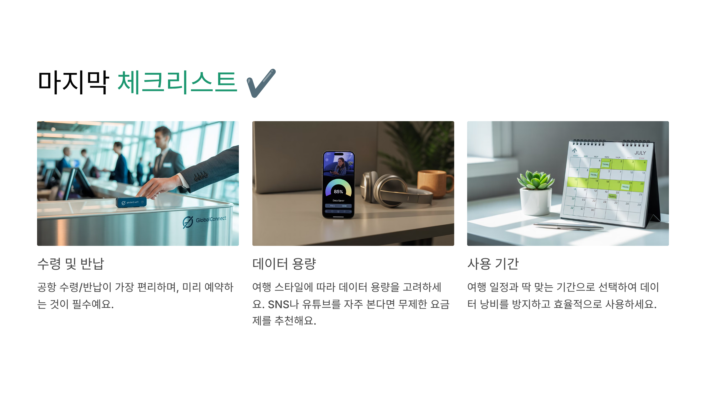 - 사용 기간: 여행 일정과 딱 맞는 기간으로 선택해야 낭비가 없어요.