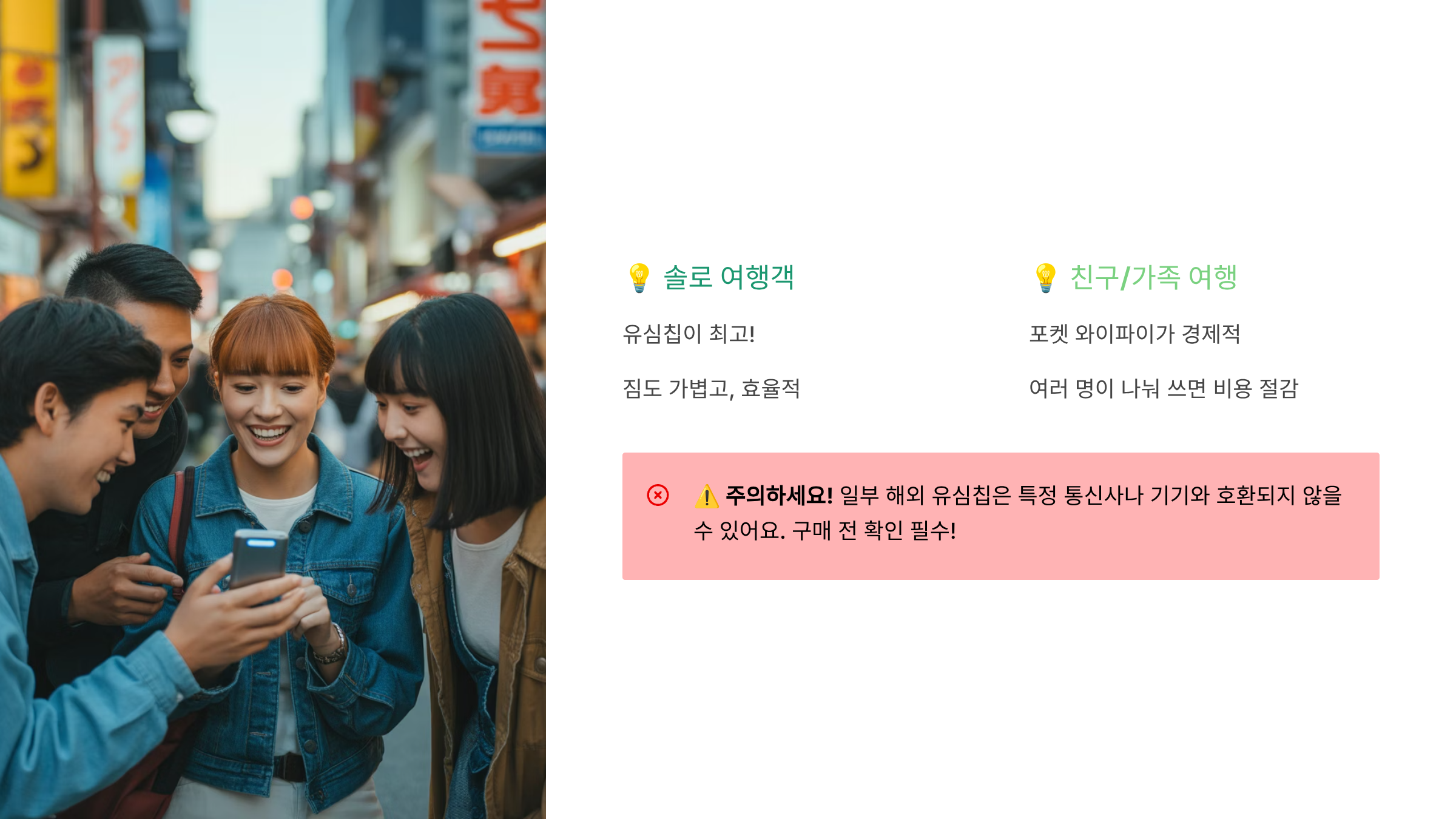 | 포켓 와이파이 | 여러 명이 함께 사용할 수 있어 가성비 최고! 대용량 데이터 사용에 유리. | 기기 충전, 휴대 필수. 분실 및 파손 위험이 있어요. |