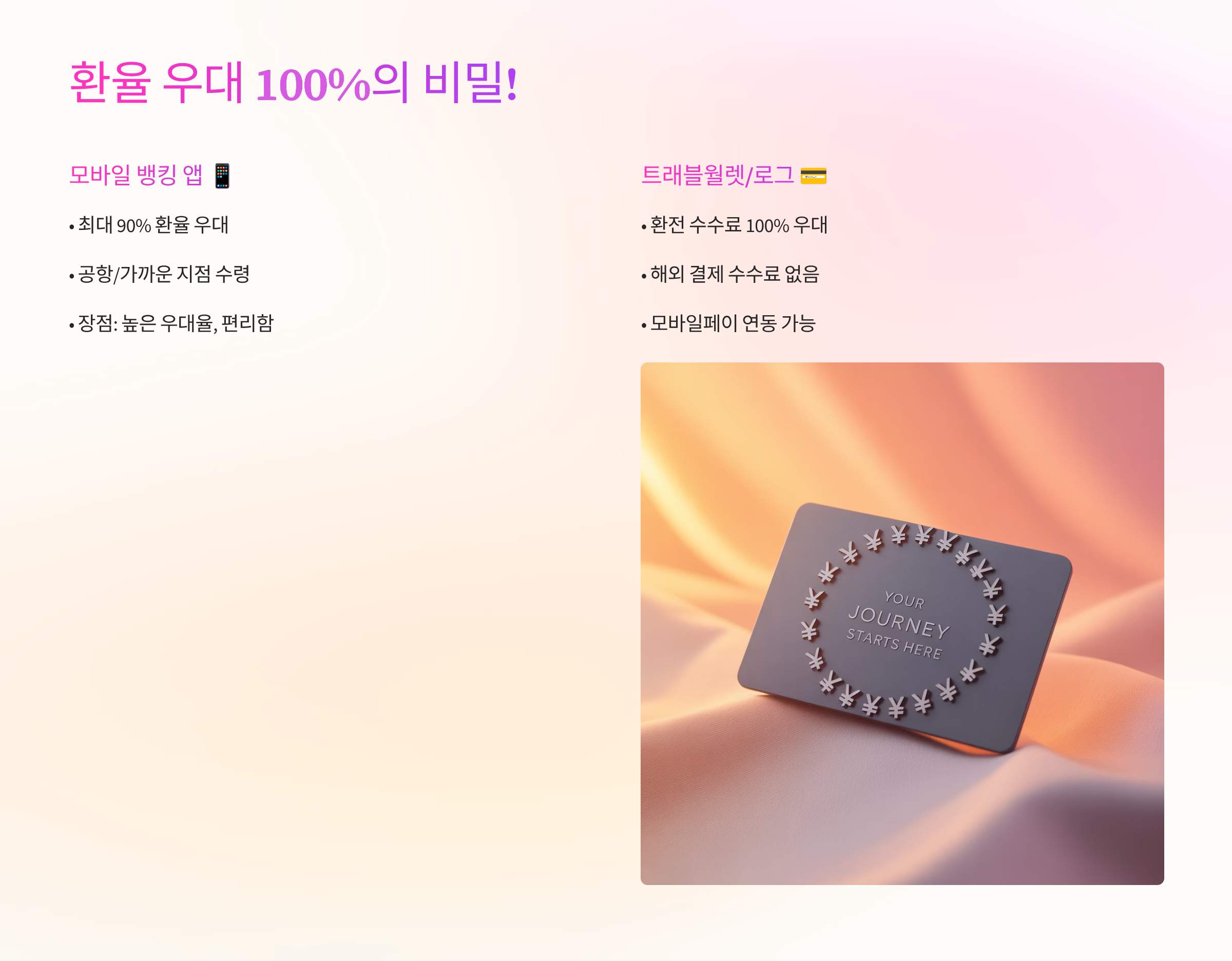 - 장점: 높은 환율 우대 (80~90%), 편리한 수령, 안전성