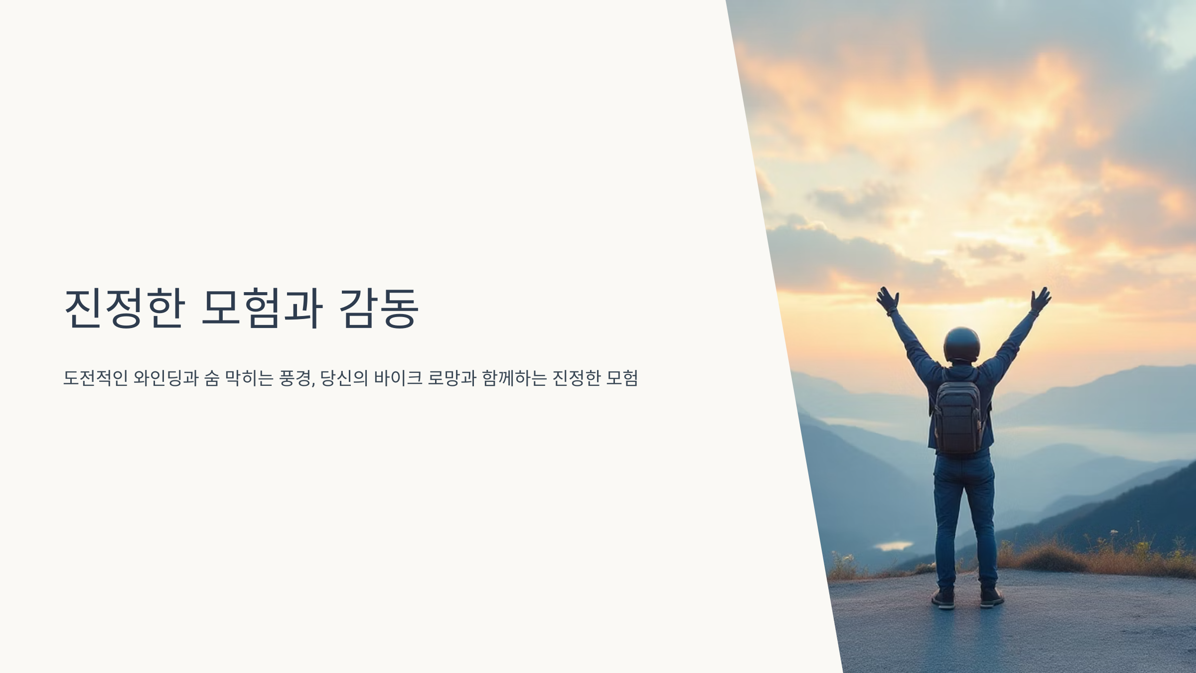 오토바이의 엔진 소리가 심장을 울리고, 눈앞에 끝없이 펼쳐진 도로가 당신을 유혹합니다.