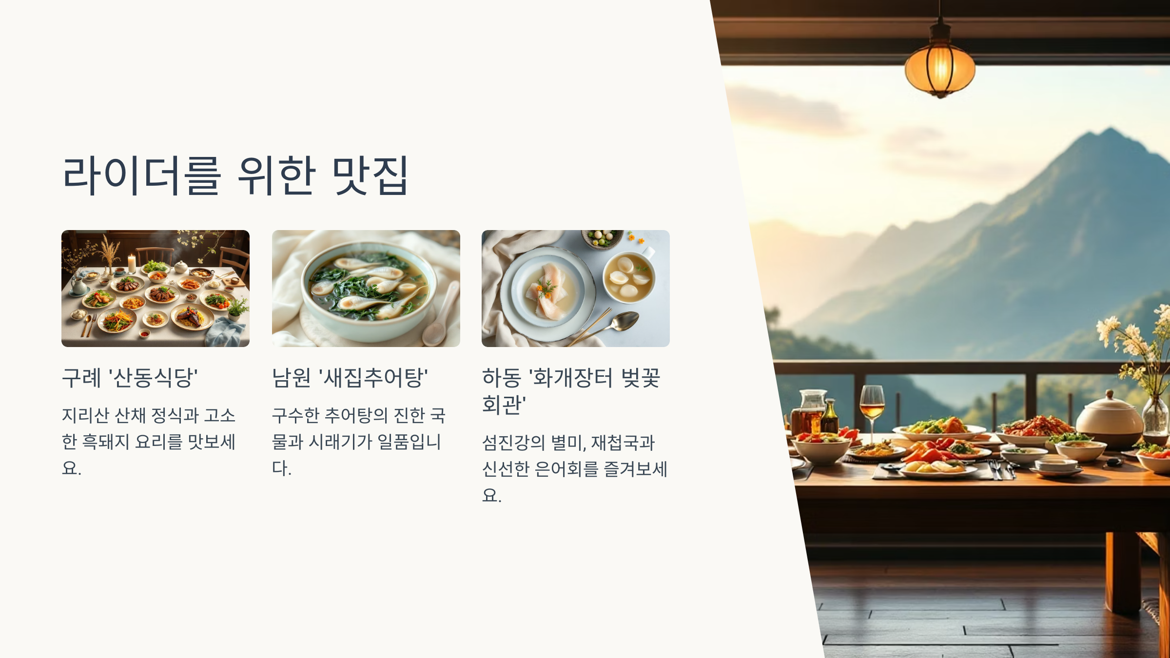 지리산 라이딩 후에는 지리산의 기운을 담은 건강하고 맛있는 음식을 맛봐야겠죠? 지역 특산물을 활용한 맛집들을 소개해 드릴게요.