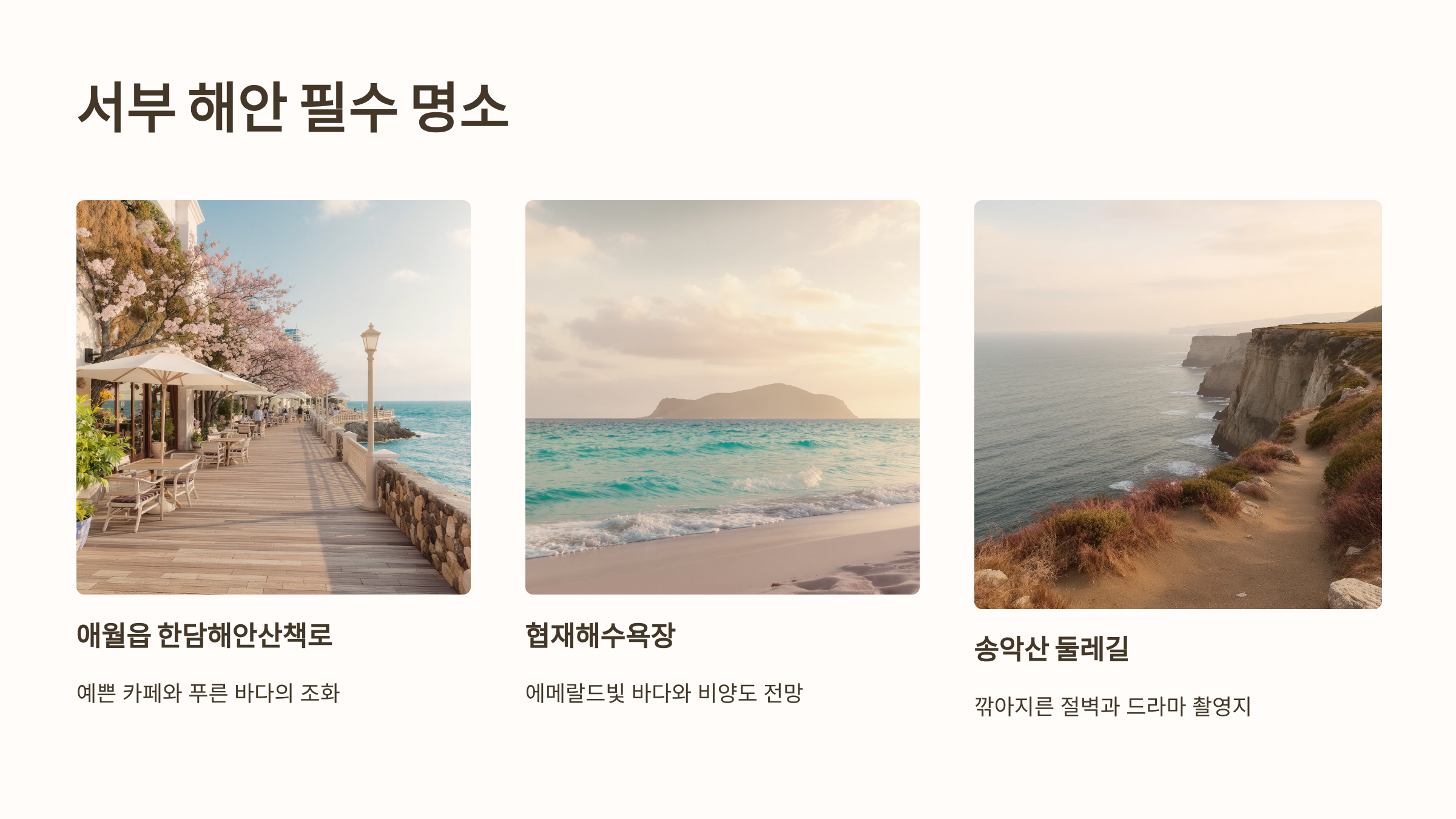 - 애월읍 한담해안산책로: 예쁜 카페와 푸른 바다가 어우러져 있어요. 산책하기 정말 좋고 사진도 예쁘게 나와요!