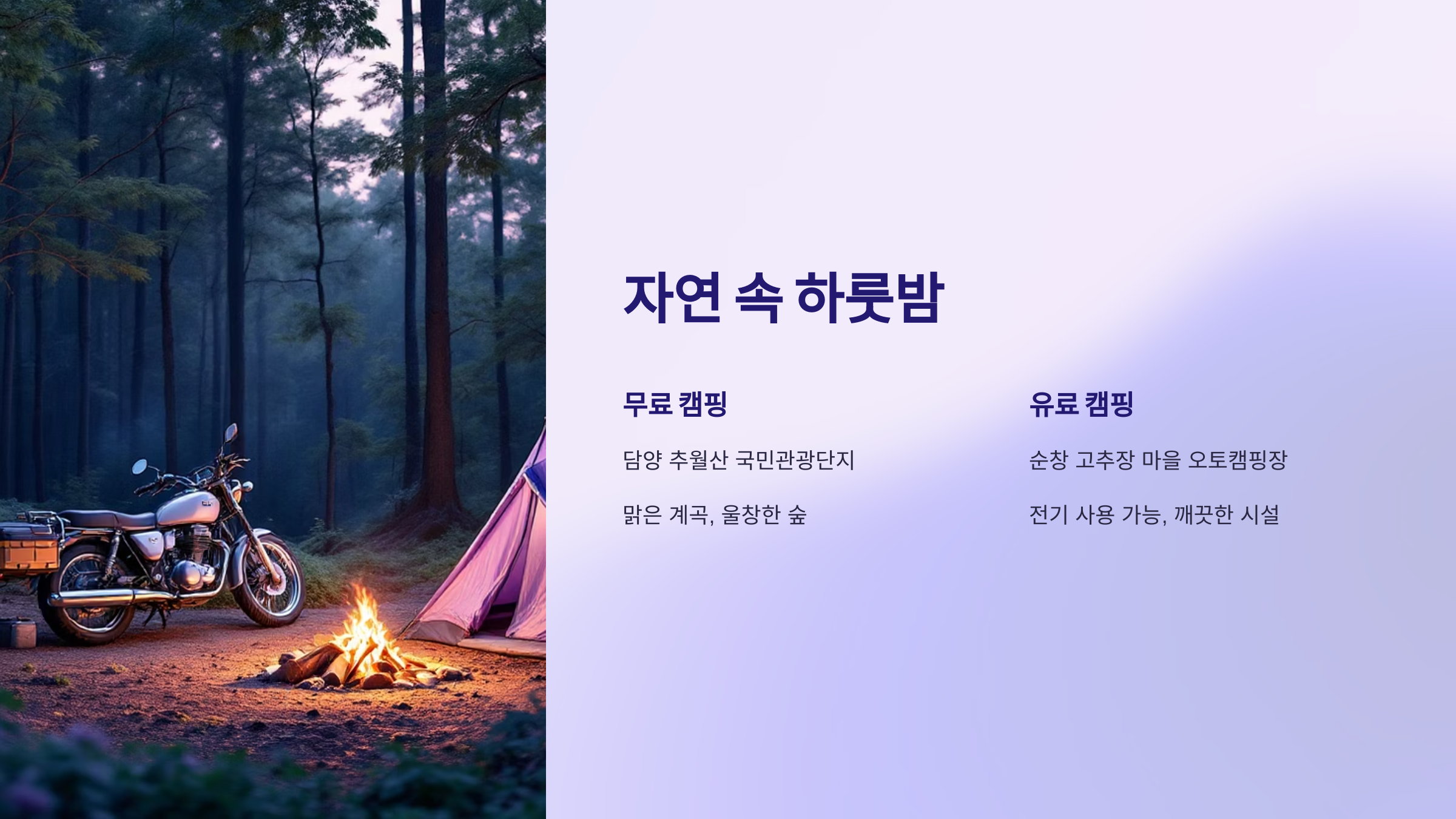메타세쿼이아길과 강천산의 아름다운 자연 속에서 캠핑을 즐기는 것은 바이크 여행의 낭만을 더해줍니다. 밤하늘의 별을 보며 자연의 소리를 듣는 경험은 잊지 못할 추억이 될 것입니다.
