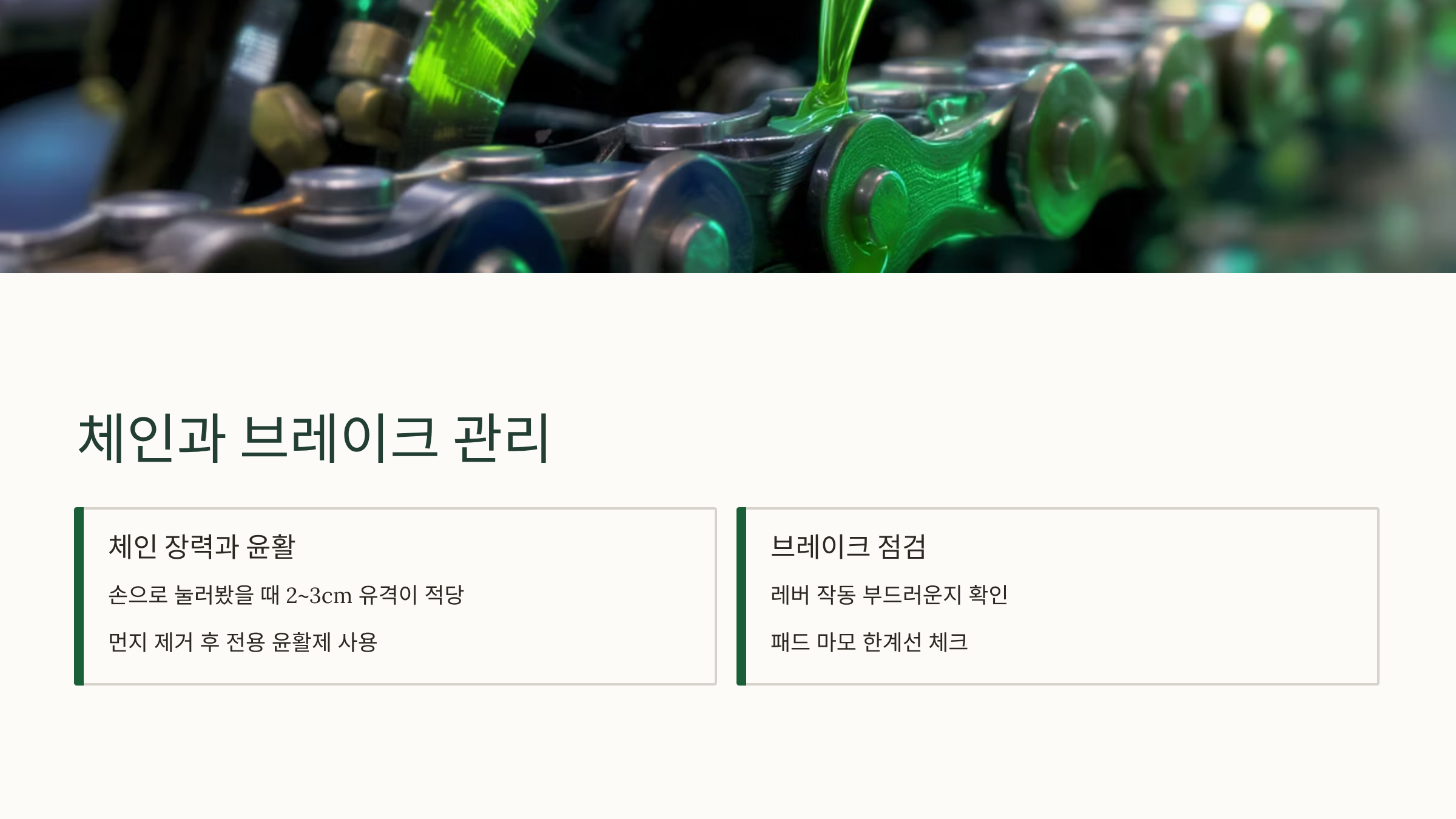 체인과 브레이크는 라이딩의 주행감과 제동력을 결정짓는 중요한 요소입니다. 특히 체인 관리는 소홀히 하기 쉽지만, 주기적인 관리가 필수예요.
