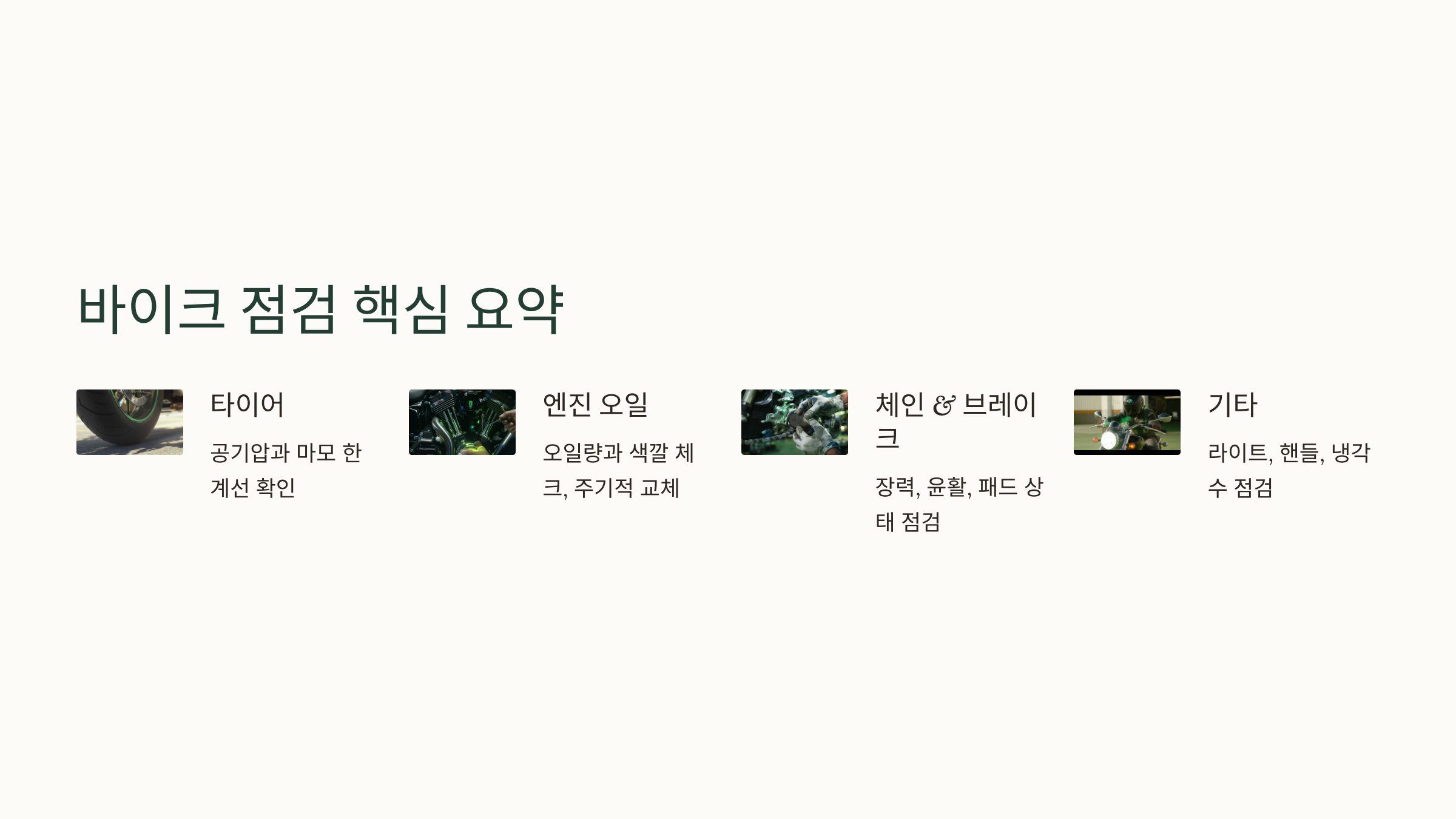 자, 오늘 알아본 내용을 한눈에 정리해볼까요? 바이크 점검은 복잡한 정비가 아니라, 매일 출발 전 5분씩 투자하는 작은 습관입니다.