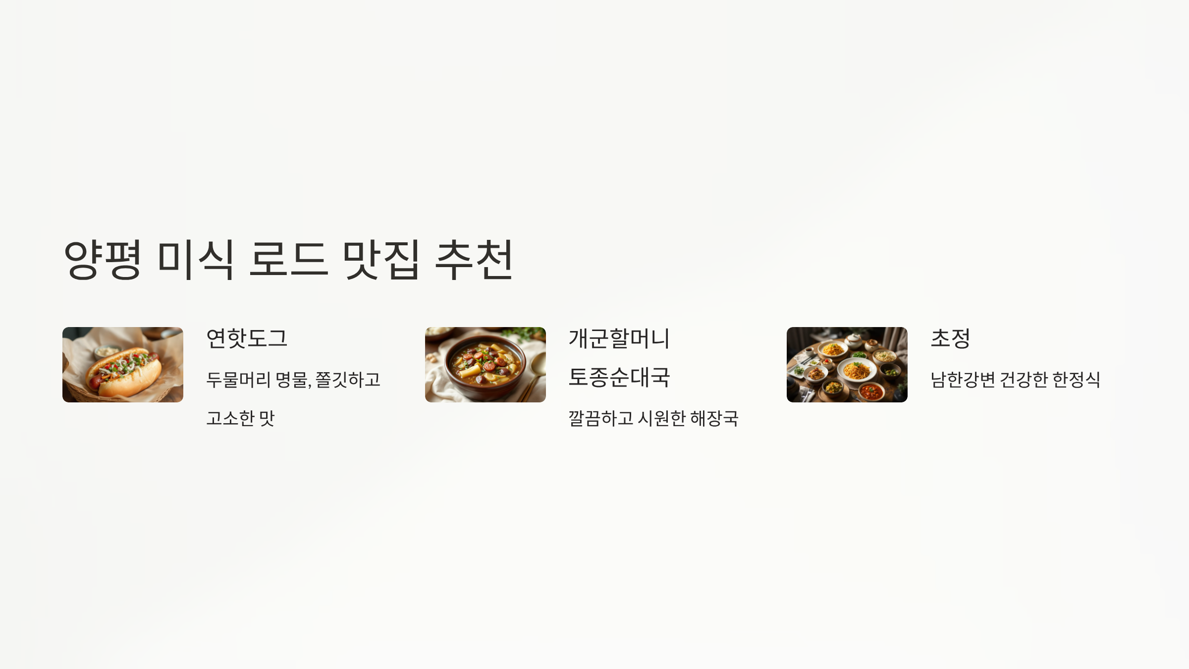 양평은 강변의 아름다운 풍경만큼이나 다채로운 먹거리가 풍부해요. 라이딩 후 지친 몸과 허기진 배를 든든하게 채워줄 맛집들을 소개해 드릴게요.