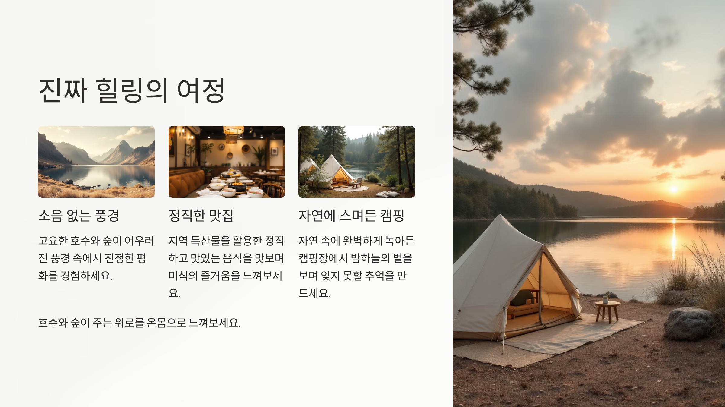 충북 충주와 괴산을 잇는 이 호수 코스는 소음 없는 풍경, 정직한 맛집, 그리고 자연에 스며든 듯한 캠핑이 어우러진 ‘진짜 힐링’의 여정입니다. 호수와 숲이 주는 위로를 온몸으로 느껴보세요.