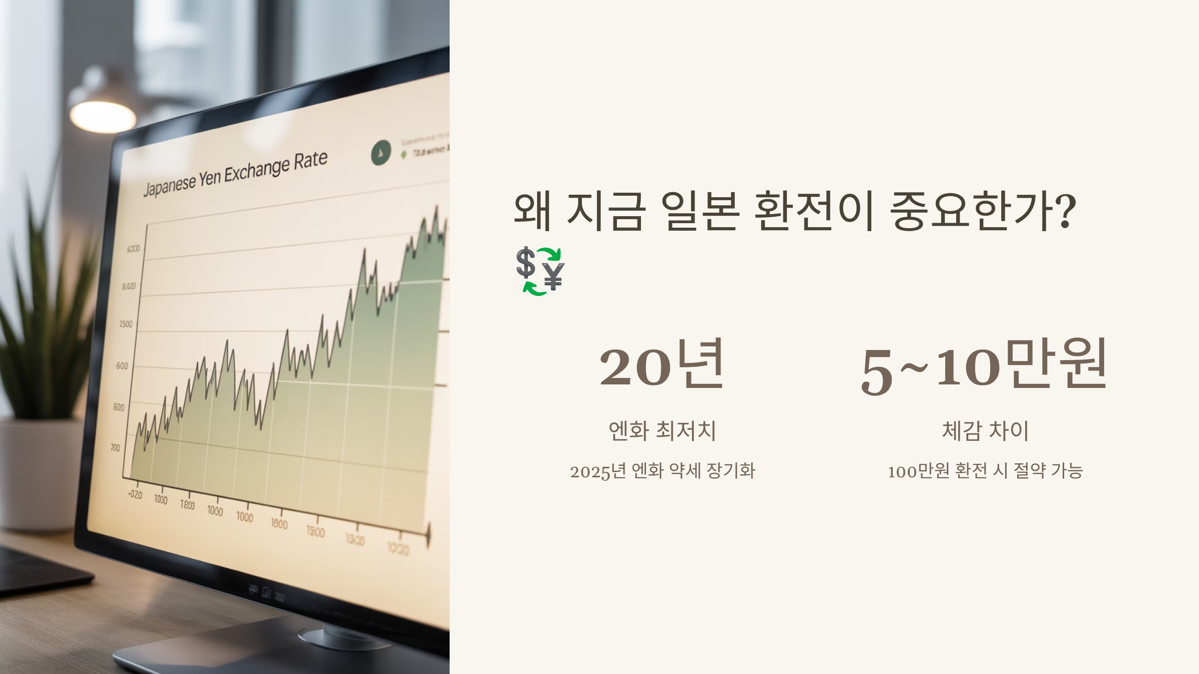 2025년 현재, 엔화 약세가 장기화되면서 일본 여행 수요가 급증하고 있습니다. 환율이 낮다는 것은 곧, 같은 돈으로 일본에서 더 많은 소비를 할 수 있다는 뜻이죠. 예를 들어 100만 원을 환전할 경우, 단순히 환율 차이만으로도 5만~10만 원의 체감 차이를 만들 수 있습니다. 이런 상황은 여행자에게 절호의 기회이자, 환율 정보를 제공하는 블로그 운영자에게는 검색 트래픽과 수익 창출의 기회가 됩니다.